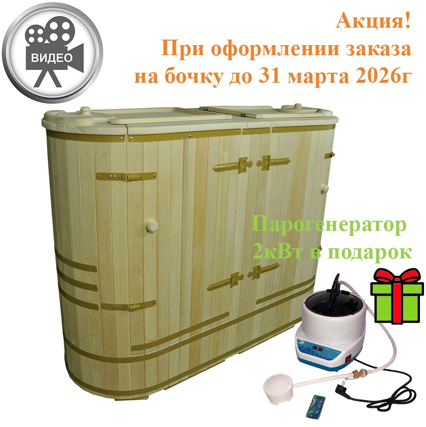 Комплектация бочки: Сиденье (4 уровня)- 2шт Трап на полу Подшейник- 2шт Крышка на горловину- 2шт Модель бочки удобна тем, что процедура парения может быть не в одиночестве, а в компании с самыми близкими людьми. Чаще всего такая бочка пользуется спросом в СПА с тайским направлением. В комплексе отдых в фитобочке + спа-уход (массаж, скрабирование и др.).Для бочки необходимо предусмотреть чуть больше места, чем для одноместной, но в остальном не возникнет никаких сложностей, ведь для нее не требуется подключение воды или слив в канализацию. Срок службы бочки рассчитан на долгие годы, особенно при должном уходе.Пороги кедровой бочки располагаются на высоте всего 22 см, что позволяет входить в неё без затруднений людям любого возраста и комплекции.
