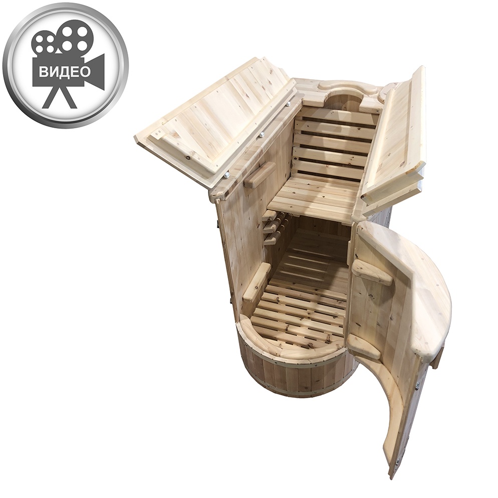 Фитобочка Полулежачая Компактная со скосом изготовлена из массива Сибирского кедра. Предназначена для универсального использования, как профессионального в SPА-салонах так и домашнего. Модель бочки одна из самых удобных и оптимальных. При сборке используется выбранный кедр 0-1 сорта. Замок сборки ламелей шип-паз, он практично себя показал за долгие годы эксплуатации бочек в разных условиях. Порог занижен до 30см, что позволяет без труда заходить в бочку. Полулежачее положение удобно тем, что во время процедуры тело более открыто без зажатостей и поэтому прогревается со всех сторон.Благодаря скосу в верхней части бочки, человек, принимающий процедуры, имеет лучший обзор, за счет чего обеспечиваются более комфортные условия парения.