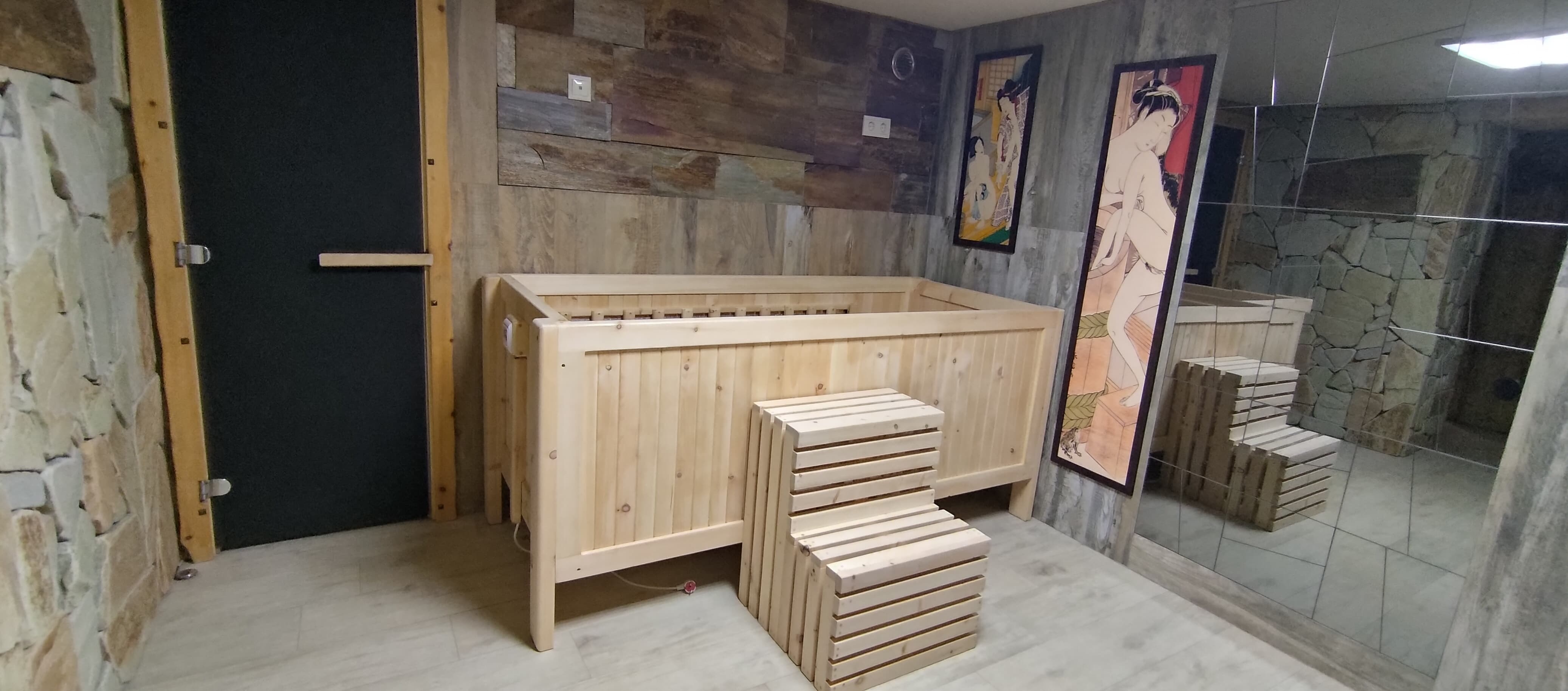 Две Купели с водой разной температуры 30С и 50С устанавливают в одно помещение с Офуро галечной и Офуро опилочная. Процедура начинается с купелей, сначала гостя усаживают в купель с горячей водой 50С на 15 минут, затем пересаживают в купель с водой 30С. Между процедурами гостя угощают травяным чаем с медом. После небольшого отдыха, гостя размещают в Офуро с разогретыми кедровыми опилками на 15 минут, далее гостя размещают в Офуро с разогретой галькой. Общее время на весь комплекс процедур занимает 2-2,5 часа.