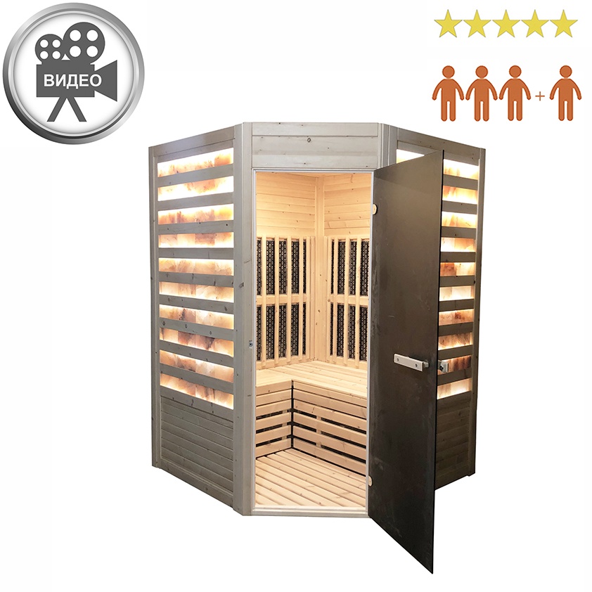 3м угловая Инфрасоляная кабина из массива Сибирского кедра представляет из себя компактное помещение, в котором размещены 10 рядов соли на фасадных стенах, а также ИК панели карбон для глубокого прогрева в щадящем режиме. Что означает прогрев при низких температурах. Такой прогрев применяют в косметологии при обертываниях, после спортивных нагрузок для расслабления мышц и др. Кабина занимает минимум места(В200*Ш150*Д150см), но при этом имеет ряд преимуществ, ее можно сделать многорежимной: