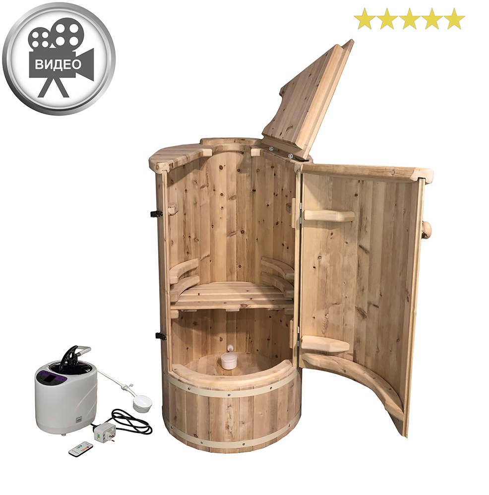 Оснащена экономичным парогенератором «Термо» наливного типа, с регулятором мощности (интервал 1-9), таймером поминутно (0-40 мин), дистанционным пультом управления, внешней аромоемкостью. Бак выполнен из нержавеющей стали (1,5л). Одной заправки воды для принятия процедур, хватает для 3-4-х человек по 20 минут. Распределение пара происходит равномерно и эффективно по всему периметру бочки.